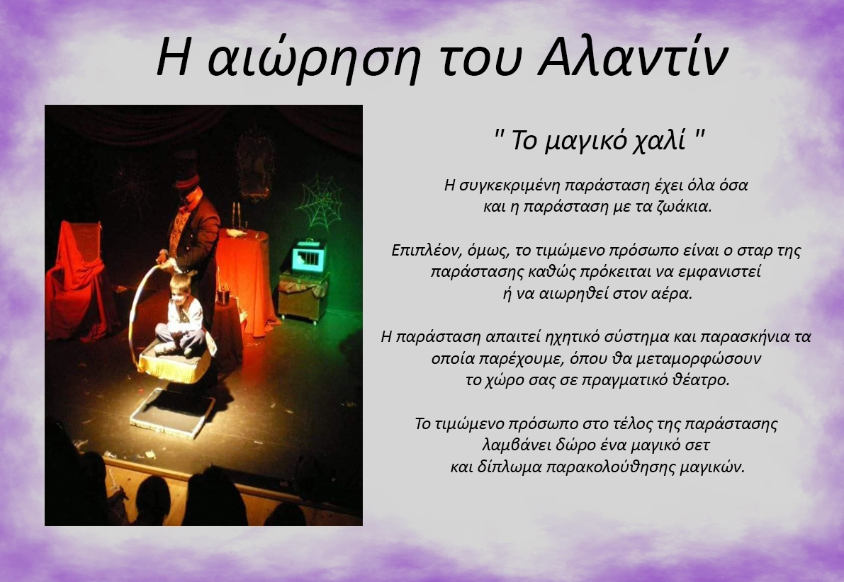 Το τιμώμενο πρόσωπο στο τέλος της παράστασης λαμβάνει δώρο ένα μαγικό σετ και δίπλωμα παρακολούθησης μαγικών.