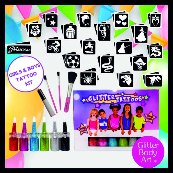 Το παιδικό μας κιτ τατουάζ glitter είναι ένα μικτό κιτ που περιέχει σχέδια στένσιλ για αγόρια και κορίτσια.