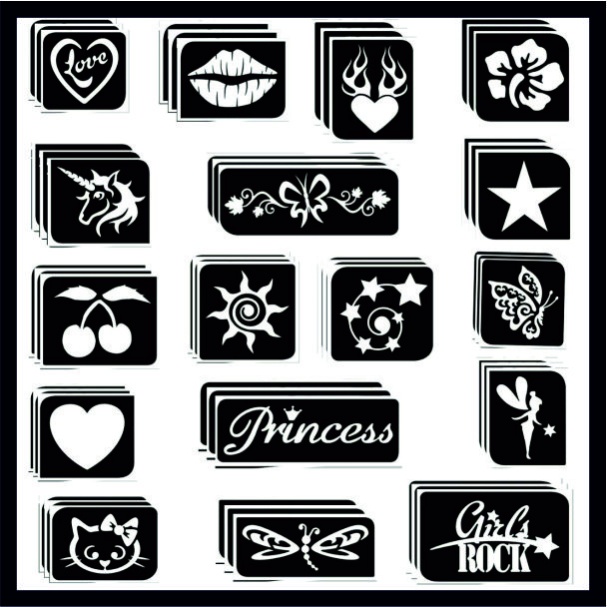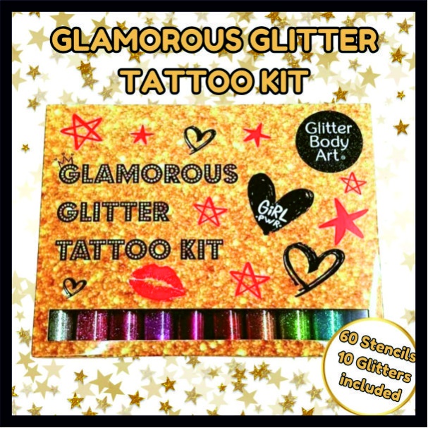 Αυτό το κιτ περιέχει: 60 πανέμορφα στένσιλ τριών στρώσεων που είναι για εύκολη εφαρμογή + 10 αστραφτερά γκλίτερ σώματος σε φυσαλίδες των 10 ml + μπουκάλι 8 ml φιλική για τα παιδιά υποαλλεργική κόλλα σώματος + Βάζο με πολύτιμες πέτρες - Απόλυτα ασφαλές.