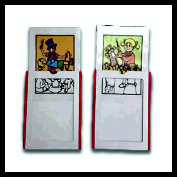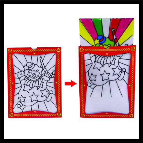 Ένα μοντέλο του διάσημου εφέ Instant Art ή Magic Painting. Ο καλλιτέχνης εμφανίζει μια ασπρόμαυρη εικόνα ενός μάγου αγοριού ή κοριτσιού σε έναν φάκελο με κομμένη πρόσοψη.