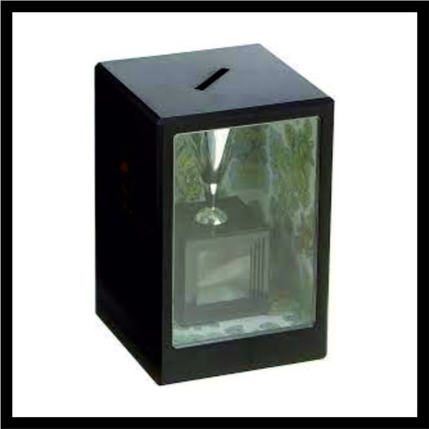 Μέσα σε αυτή την κουμπαρά, είναι ορατή μια μικρή χοάνη. Το στενό άκρο του χωνιού καταλήγει σε ένα μικρό κουτί. Όταν θέλετε, μπορείτε να βάλετε μερικά νομίσματα στη θυρίδα, και αυτά, περνώντας μέσα από το χωνί θα συρρικνωθούν μαγικά πέφτοντας μέσα στο μικρό κουτί από κάτω, όπου όλοι θα μπορούν να δουν πώς έχουν γίνει μόνο ένα κλάσμα του αρχικού τους μεγέθους!
