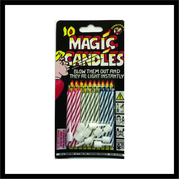 Φάρσα γενεθλίων! Κάντε το πάρτι γενεθλίων σας πιο αξέχαστο με διασκεδαστικά κεριά. Παρακολουθήστε και απαθανατίστε τις πολύτιμες αντιδράσεις τους καθώς προσπαθούν να σβήσουν τα αναμμένα κεριά. Κάθε πακέτο περιέχει 10τεμ. μαγικά κεριά που ανάβουν ξανά με 4 διάφορα χρώματα. Κάθε κερί ύψος 5cm με βάση 1,5cm = 6,5cm.