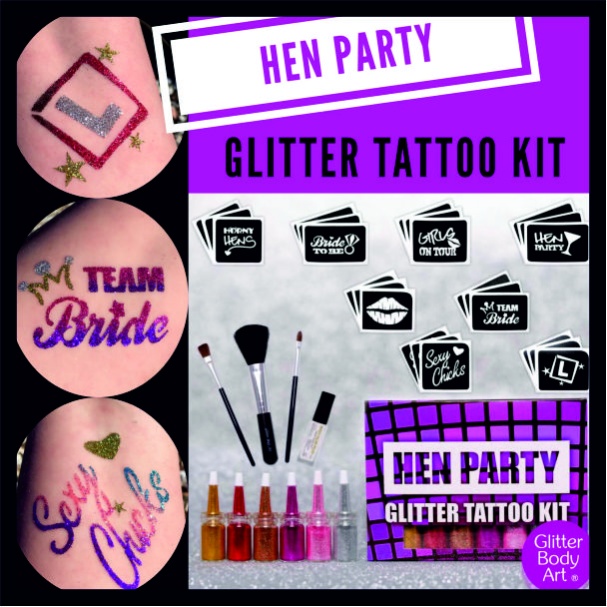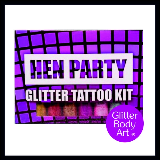 Το νέο μας κουτί δώρου Hen Party Glitter Tattoo περιλαμβάνει: 5ml Body Adhesive + 1 Brush Set + 24 Glitter Tattoo Stencils (με θέμα το Hen Party) + 6 Glitter - μπουκάλια puffer 5gm