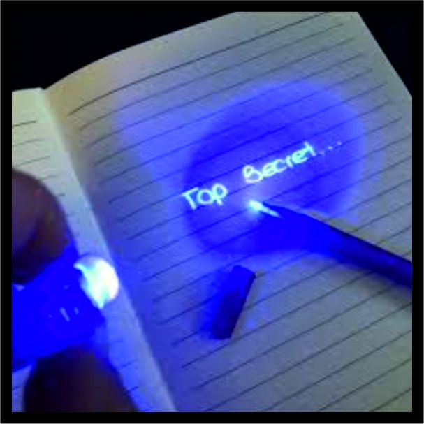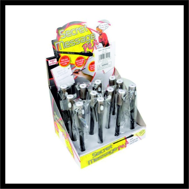 Γράψτε μυστικά μηνύματα στους φίλους σας με αυτό το στυλό! Όταν γράφετε με αυτό το στυλό, οι λέξεις παραμένουν κρυμμένες μέχρι να αποφασίσετε να τις αποκαλύψετε. Μπορείτε να κάνετε ξανά ορατές τις λέξεις με το ειδικό φως φλας που περιλαμβάνεται στο καπάκι του στυλό.