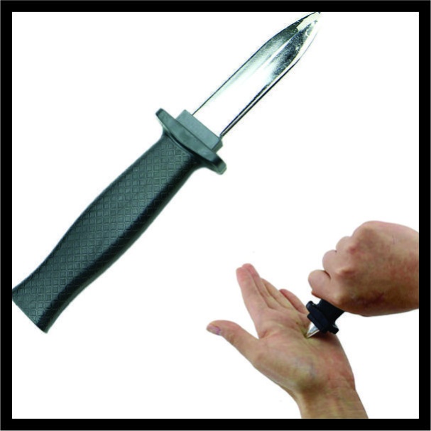 Αυτό το ψεύτικο μαχαίρι διαθέτει ένα μικρό πλαστικό μαχαίρι με αναδιπλούμενη ασημί λεπίδα με ελατήριο, η οποία γλιστράει στη μαύρη λαβή καθώς μαχαιρώνετε το θύμα σας και γλιστράει ξανά έξω όταν απομακρύνεστε. Συνολικό μήκος περίπου: 18 cm.